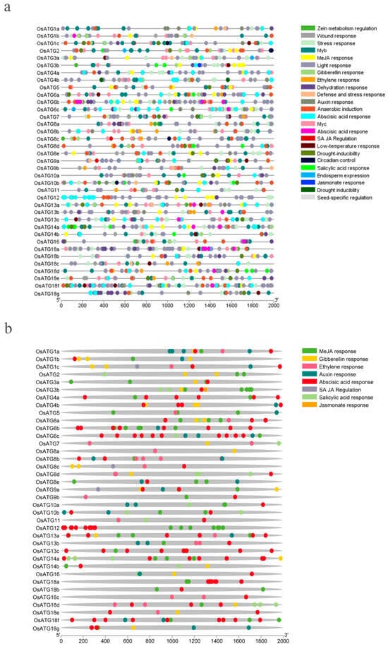Cis-acting elements analysis of OsATGs. (a) The distribution of all cis-acting elements in OsATGs. The scale represents the sequence length of 2kb upstream of the OsATG genes, and the boxes of different colors represent different cis-acting elements (CREs). There are a total of 24 CREs distributed in the promoter regions of 37 OsATGs. (b) The distribution of cis-acting elements related to plant hormones in OsATGs. The scale represents the sequence length of 2kb upstream of the OsATG genes, and the boxes of different colors represent different cis-acting elements. There are a total of 7 CREs related to plant hormones distributed in the promoter regions of 37 OsATGs.