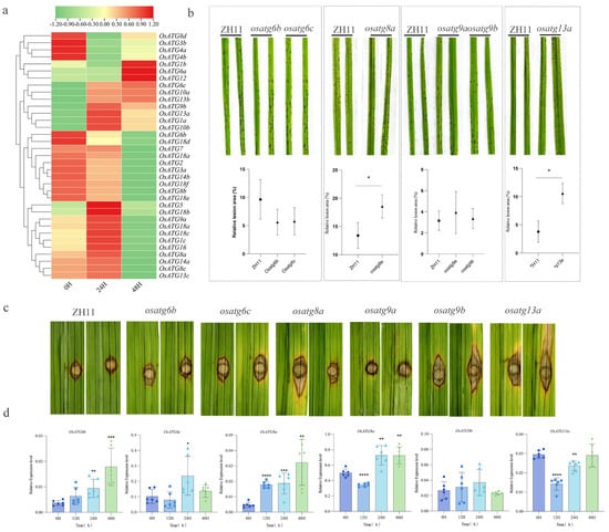 Using the available transcriptome data during infection by M. oryzae in rice, a hierarchical clustering heatmap was generated to analyze the expression patterns of OsATGs. Out of the 37 OsATG genes analyzed, with the exception of OsATG8e and OsATG18g, all were expressed and showed differential expression patterns (Figure 5a and Table S2). The results also showed that 17 OsATGs exhibited increased expression at 24 h post-infection, while 10 OsATGs showed increased expression at 48 h. Notably, six OsATGs (OsATG1b, OsATG6a, OsATG6c, OsATG10a, OsATG12, and OsATG13b) displayed sustained increased expression throughout the 0–48 h period. These results strongly suggest that autophagy plays a significant role in conferring resistance to rice blast fungus.