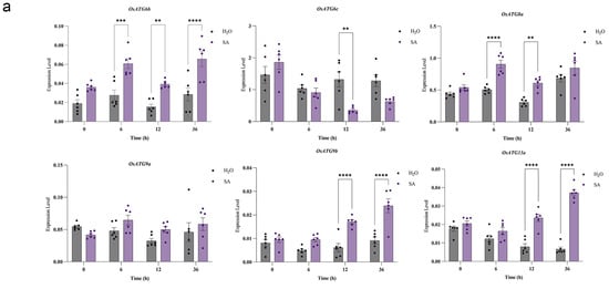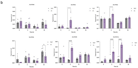 In order to investigate whether OsATGs are involved in the SA and JA signaling pathways, we analyzed the expression levels of OsATG6b, OsATG6c, OsATG8a, OsATG9a, OsATG9b, and OsATG13a genes in the wild-type ZH11 after induction with SA and MeJA at 0, 6, 12, and 36 h. The results showed that five OsATG genes (OsATG6b, OsATG6c, OsATG8a, OsATG9b, and OsATG13a) were responsive to the SA signaling pathway (Figure 6a), while five OsATG genes (OsATG6c, OsATG8a, OsATG9a, OsATG9b, and OsATG13a) were responsive to the SA signaling pathway (Figure 6b). Under SA induction, OsATG6b and OsATG8a were rapidly upregulated at 6 h, indicating their potential involvement in the rapid response to the SA pathway. OsATG9b and OsATG13a were upregulated from 12 to 36 h, while the expression level of OsATG6c decreased at 12 h. Similarly, under JA induction, the expression levels of four genes (OsATG6c, OsATG8a, OsATG9b, and OsATG13a) significantly increased at 6 h, demonstrating a rapid response to the JA signal, while the expression level of OsATG9a decreased at 36 h. Based on the above data, we hypothesize that OsATGs may participate in rice growth, development, and stress response mediated by SA or JA signaling pathways.