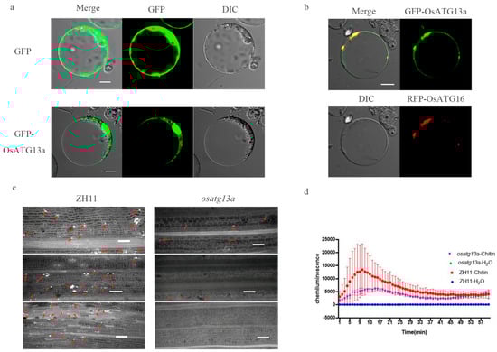 Based on our analysis of pathogenicity and gene expression patterns induced by the plant hormones SA and JA, we have discovered that OsATG13a plays an important role in rice resistance against the blast fungus. To further investigate its function, we conducted a subcellular localization assay on OsATG13a. The results showed that OsATG13a was localized in the cytoplasm, with a strong punctate localization (Figure 7a). This punctate localization is consistent with the positioning of ATG16 in the phagosome [32]. Furthermore, our investigation revealed that GFP-OsATG13a co-localized with RFP-ATG16, confirming that the strong punctate localization of OsATG13a corresponds to the phagosome (Figure 7b).