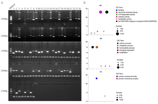 Screening and analysis of interacting proteins of OsATG13a. (a) PCR validation of yeast transformants. Maker represents maker III, and the sizes of the 7 bands in maker III are 4500, 3000, 2000, 1200, 800, 500, and 200 bp, respectively. The size range of bands used for sequencing is 500–2000 bp. (b) GO analysis of potential interacting proteins of OsATG13a. MF represents Molecular Function, CC represents Cellular Component, and BP represents Biological Process. Different colors of circles represent different categories, and the size of the circles represents the number of clusters.