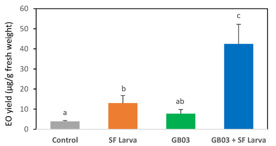 EO content was not altered (p > 0.05) by inoculation with GB03 (Figure 1). However, it increased three-fold with respect to the control (p < 0.05) in plants that suffered damage by Spodoptera frugiperda larvae (SF). On the other hand, it increased tenfold when the plants were exposed to both treatments in combination, which demonstrates synergy between the treatments (Figure 1). This was further corroborated by the two-way analysis of variance, which showed a highly significant interaction between the effects of the two treatments on EO (p < 0.05). In other words, herbivory and inoculation have influenced each other, leading to a significant rise in EO content compared to each treatment.