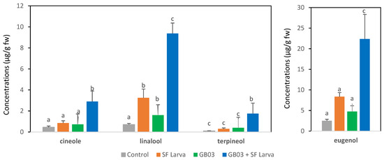 The treatments were also associated with differences in the concentration of major components in the EO (Figure 2). The concentration of cineole and terpineol did change significantly after treatment in relation to the control (p > 0.05). However, the combination of both treatments resulted in a 6- and 17-fold increase in these components, respectively, compared with control plants (p < 0.05). Linalool and eugenol were approximately 2–4-times higher in plants that received the individual treatments than in the control group (p > 0.05). When plants were inoculated and subsequently damaged by SF, the increase in these components was much more remarkable, with levels being 9–13-times higher than in the control (p < 0.05).