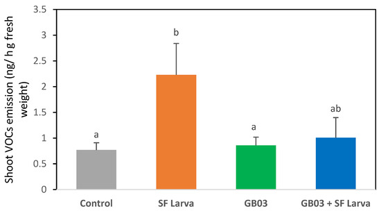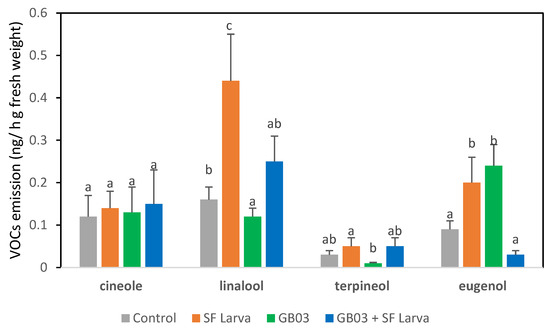 Emission of volatile organic compounds (VOCs) by O. basilicum plants inoculated with B. amyloliquefaciens (GB03) and/or exposed to S. frugiperda. Different letters indicate statistically significant differences according to Fisher’s LSD test (p < 0.05).