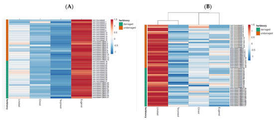 Clustered heat map of the effects of Spodoptera frugiperda herbivory, inoculation with B. amiloliquefaciens GB03, and their combination on: (A) EO composition, and (B) emitted VOCs.