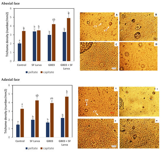 Histological units called glandular trichomes are responsible for producing and storing EO. Although these trichomes were found on both sides of the leaf in O. basilicum, they were more abundant on the abaxial side (Figure 6). The density of capitate trichomes (CT) increased on both sides only in the leaves of plants that were inoculated and damaged by herbivory (p < 0.05). Peltate trichomes (PT), the primary site for EO synthesis [49], were denser in inoculated than in non-inoculated plants. More precisely, their density was around 50% higher on the abaxial side and 20% higher on the adaxial side than in the control. When comparing plants exposed to herbivory to their control, the increase in PT density was more noticeable: the trichomes were 70% and 40% denser on the abaxial and adaxial side, respectively (p < 0.05). The combination of treatments, however, did not lead to significant differences in PT density with respect to the corresponding controls (exposure to SF larvae or GB03 inoculation), on either side of the leaf (p > 0.05).