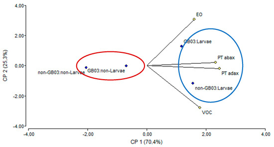 Principal component analysis for the physiological response of O. basilicum to insect chewing herbivory and PGPR inoculation. EO: essential oil yield, VOC: volatile organic compound emissions, PTadax: density of peltate trichomes on the adaxial side, and PTabax: density of peltate trichomes on the abaxial side.
