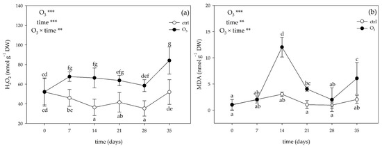 Variation in (a) hydrogen peroxide (H2O2) content, and (b) the concentration of malondialdehyde by-products (MDA) in leaves of Melissa officinalis plants exposed to charcoal-filtered air (control; open circle) or to 80 ppb of ozone (O3; 5 h day─1) for 35 consecutive days (closed circle). Data are shown as mean ± standard deviation (n = 5). For each parameter, p levels for the effects of the singular factor “O3” and “time”, and their combination from a two-way ANOVA are shown (***: p ≤ 0.001; **: p ≤ 0.01). According to Tukey’s HSD post hoc test, different letters indicate significant differences among means. Abbreviation: DW, dry weight.