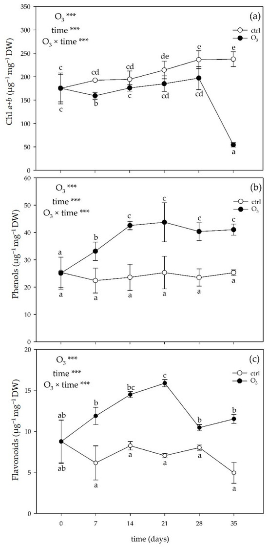 Variation in (a) total chlorophyll (Chl a + b), (b) phenols, and (c) flavonoids in leaves of Melissa officinalis plants exposed to charcoal-filtered air (control; open circle) or to 80 ppb of ozone (O3; 5 h day─1) for 35 consecutive days (closed circle). Data are shown as mean ± standard deviation (n = 5). For each parameter, p levels for the effects of the singular factor “O3” and “time”, and their combination from a two-way ANOVA are shown (***: p ≤ 0.001). According to Tukey’s HSD post hoc test, different letters indicate significant differences among means. Abbreviation: DW, dry weight.