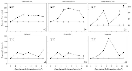 Responses of (a) rosmarinic acid, (b) trans-cinnamic acid, (c) protocatechuic acid, (d) apigenin, (e) hesperidin, and (f) hesperetin over a range of cumulative ozone (O3) uptakes (CUOs) in leaves of Melissa officinalis plants exposed to charcoal-filtered air (control = 100%; open circle) or to 80 ppb of O3 (5 h day−1) for 35 consecutive days (closed circle). The responses were calculated as Response = µC/µT × 100, where µC is the mean value of μ of the control and µT is the mean value of μ of the O3-treated samples.