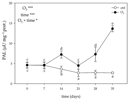 Variation in phenylalanine ammonia-lyase (PAL) activity in leaves of Melissa officinalis plants exposed to charcoal-filtered air (open circle) or to 80 ppb of ozone (O3, 5 h day─1) for 35 consecutive days (closed circle). Data are shown as mean ± standard deviation (n = 5). p levels for the effects of the singular factor “O3” and “time”, and their combination from a two-way ANOVA are shown (***: p ≤ 0.001; *: p ≤ 0.05). According to Tukey’s HSD post hoc test, different letters indicate significant differences among means. One unit of PAL activity was defined as the amount of enzyme required to produce 1 μmol of trans-cinnamic acid per min.