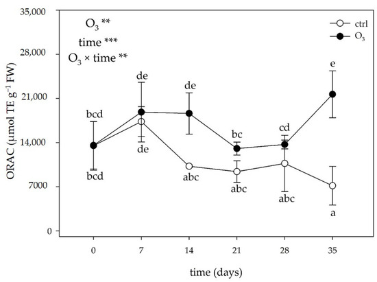 Variation in oxygen radical absorption capacity (ORAC) in leaves of Melissa officinalis plants exposed to charcoal-filtered air (open circle) or to 80 ppb of ozone (O3, 5 h day─1) for 35 consecutive days (closed circle). Data are shown as mean ± standard deviation (n = 5)., p levels for the effects the effects of the singular factor “O3” and “time”, and their combination from a two-way ANOVA are shown (***: p ≤ 0.001; **: p ≤ 0.01). According to Tukey’s HSD post hoc test, different letters indicate significant differences among means. Abbreviation: TE, trolox equivalent.