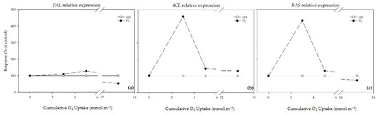 Responses of (a) phenylalanine ammonia-lyase (PAL), (b) 4-coumarate CoA-ligase (4CL), and (c) rosmarinic acid synthase (RAS) relative expression, over a range of cumulative ozone (O3) uptakes (CUOs) in leaves of Melissa officinalis plants exposed to charcoal-filtered air (control = 100%; open circle) or to 80 ppb of O3 (5 h day−1) for 35 consecutive days (closed circle). The responses were calculated as response = µC/µT × 100, where µC is the mean value of μ of the control and µT is the mean value of μ of the O3-treated samples.