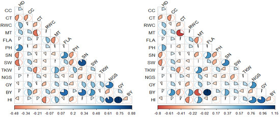 Correlogram representing phenotypic (left) and genotypic (right) correlation coefficients among the 13 measured traits in the durum wheat cultivars. HD: Heading date, CC: Chlorophyll content, CT: Canopy temperature, RWC: Relative water content, MT: Membrane thermostability, FLA: Flag leaf area, PH: Plant height, SN: Spike number, SW: Spike weight, TKW: Thousand kernel weight, NGS: Number of grains per spike, GY: Grain yield, BY: Biological yield, HI: Harvest index.