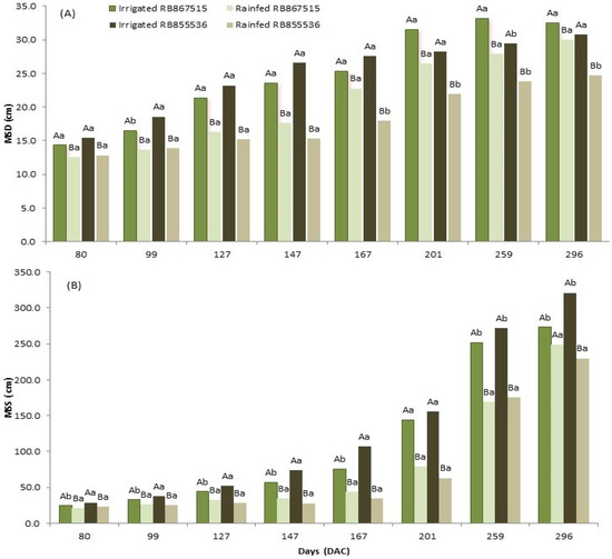 (A) Mean stalk diameter (MSD) and (B) mean stalk stature (MSS) of two sugarcane varieties (RB867515 and RB855536) evaluated at 80, 99, 127, 147, 167, 201, 259, and 296 days after cutting (DAC), under the water regime: full irrigation and stressed treatment. In each evaluation period, capital letters compare the water regimes for each variety and lowercase letters compare the varieties within each water regime. Means followed by equal letters do not differ in a Tukey’s test at 5% probability.