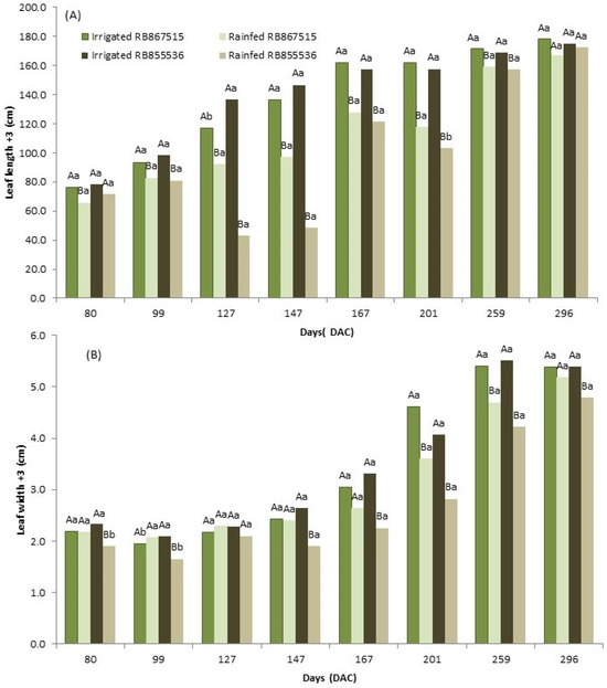 (A) Leaf length +3 (C + 3) and (B) leaf width +3 (L + 3) of two sugarcane varieties (RB867515 and RB855536) rated at 80, 99, 127, 147, 167, 201, 259, and 296 days after cutting (DAC) under the water regimes: fully irrigated and stressed. In each evaluation period, capital letters compare the water regimes for each variety and lowercase letters compare the varieties within each water regime. Means followed by equal letters do not differ in a Tukey’s test at 5% probability.