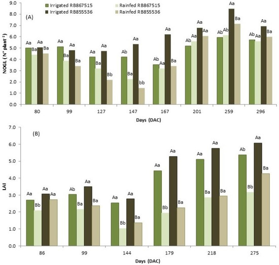(A) Number of open green leaves (NOGL) evaluated at 80, 99, 127, 147, 167, 201, 259, and 296 days after cutting (DAC) and (B) leaf area index (LAI) evaluated at 86, 99, 145, 179, 218, and 275 days after cutting (DAC) under the water regimes of two sugarcane varieties (RB867515 and RB855536): fully irrigated and stressed. In each evaluation period, capital letters compare the water regimes for each variety and lowercase letters compare the varieties within each water regime.