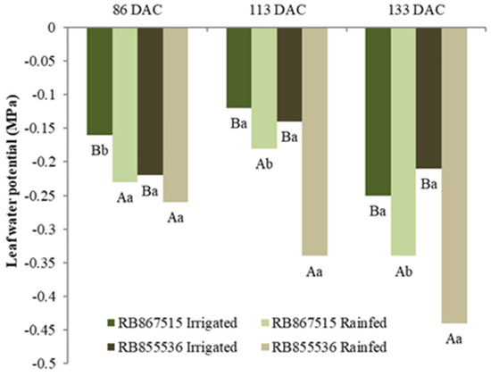 Leaf water potential of two sugarcane varieties (RB867515 and RB855536) evaluated at 86, 113, and 133 days after cutting (DAC), cultivated under water regimes: full irrigation and stressed. In each evaluation period, uppercase letters compare the water regimes for each variety, and lowercase letters compare the varieties within each water regime. Means followed by equal letters do not differ in a Tukey test at 5% probability.