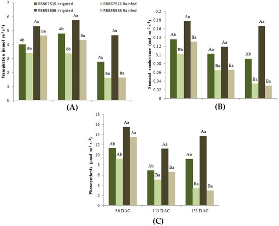 Transpiration (A), stomatal conductance (B), and liquid photosynthesis (C) of two sugarcane varieties (RB867515 and RB855536) evaluated at 86, 113, and 133 days after cutting water regimes: fully irrigated and stressed. In each evaluation season, uppercase letters compare the water regimes for each variety, and lowercase letters compare the cultivars within each water regime. Means followed by equal letters do not differ in a Tukey test at 5% probability.