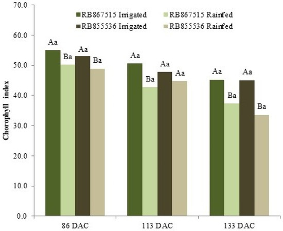 Chlorophyll index of two varieties of sugarcane (RB867515 and RB855536) evaluated at 86, 113, and 133 days after cutting (DAC), cultivated under water regimes: fully irrigated and stressed. In each evaluation period, uppercase letters compare the water regimes for each variety and lowercase letters compare the varieties within each water regime. Means followed by equal letters do not differ in a Tukey test at 5% probability.