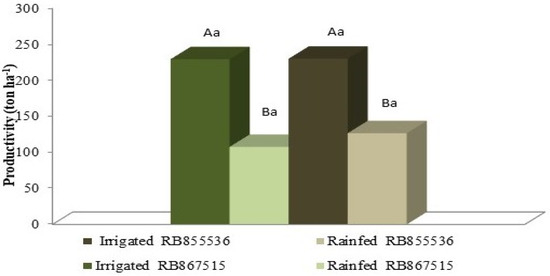 Productivity of two sugarcane varieties (RB855536 and RB867515) cultivated under water regimes: full irrigation and stressed. Capital letters compare the water regimes for each variety, and lowercase letters compare the varieties within each water regime. Means followed by equal letters do not differ in a Tukey’s test at 5% probability.