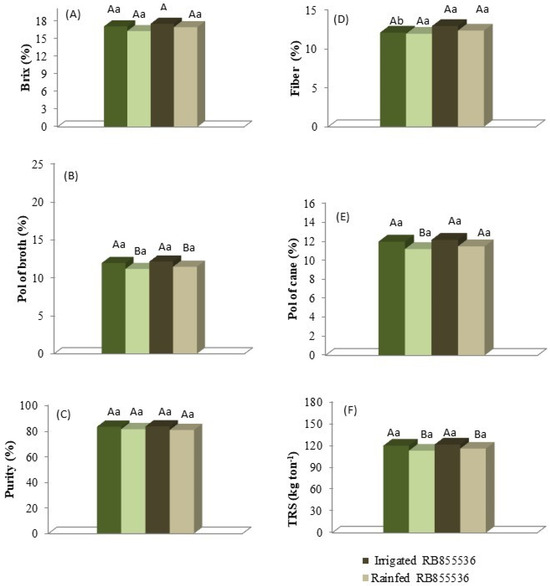 (A) Brix, (B) Pol, (C) broth purity, (D) fiber, (E) sugarcane pol, and (F) total recoverable sugar content (TRS) of two sugarcane varieties (RB867515 and RB855536) under the water regimes: fully irrigated and stressed. Capital letters compare the water regimes for each variety, and lowercase letters compare the varieties within each water regime. Means followed by equal letters do not differ in a Tukey’s test at 5% probability.