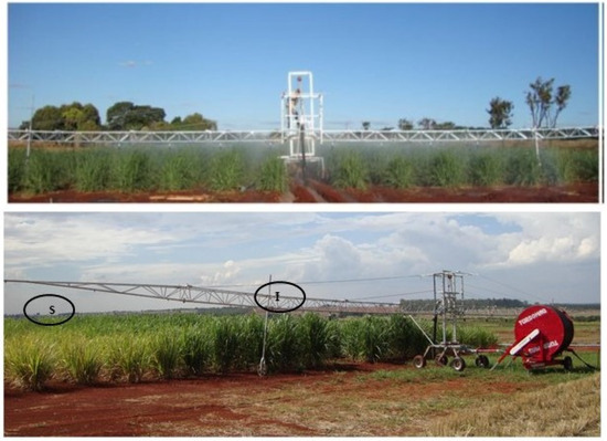 Sugarcane shows a reduction in growth in certain periods due to the adverse winter weather conditions of the Cerrado in the Brazilian central–western region, such as lower water availability. The most accentuated development phase begins with the resumption of regular rainfall, an increase in light intensity and temperature, and occurs from December to March [5]. In the central–west region of Brazil, even in regions with long dry periods, it is customary to make a single 40/60 mm rescue irrigation right after harvest, to guarantee sugarcane sprouting [6]. Therefore, irrigation plays an important role in sugarcane production, especially in regions with a long drought period, like the Cerrado [7,8]. Rodolfo Junior et al. [9] found higher sugarcane yields during the dry period in the Brazilian Cerrado when the water applied exceeded the amount commonly used by the farmers.