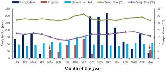 The first top-dressing fertilization was applied manually and, after the first cut of the plants, was carried out in two periods: 400 kg ha−1 NPK (using formula 4:30:16) at the same time as rescue irrigation and 600 kg ha−1 of NPK in November (18 months after the planting date) at the beginning of the rainy season.