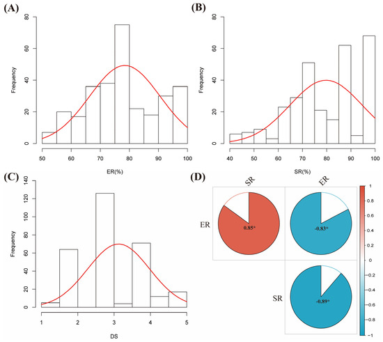 Phenotypic diversity of the 299 soybean accessions to RCR. (A) Emergence rate (ER, %), (B) survival rate (SR, %), (C) disease severity (DS), and (D) heatmap of Pearson correlation coefficients (r) among the ER, SR, and DS were significant at p < 0.05. The red curve on the frequency plots (A–C) represents a normal distribution line. * Significant at p < 0.05.