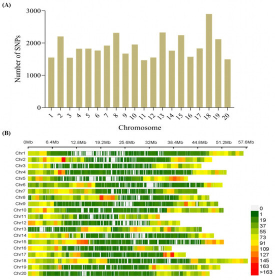 Distribution of high-quality SNPs across the chromosomes of soybean. (A) Number of SNPs per chromosome. (B) Number of SNPs within 1 Mb window size of each chromosome.