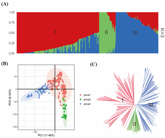 Population relatedness has been demonstrated to cause false positives in marker–trait association (MTA) mapping [30,31]. Consequently, it is required to further assess the extent of relatedness among the 299-soybean accession. The mapping population was optimally grouped into three subpopulations (i.e., I, II, and III) based on model-based analysis in ADMIXTURE software version 1.3.0 (Figure 3A). The groupings from ADMIXTURE software were largely similar to those obtained from principal component analysis (PCA) and neighbor-joining tree (Figure 3B,C). Also, the 299 accessions were grouped into three according to how the pairwise kinship coefficients are distributed. The subpopulation I/group I comprised G. max accessions from Asian countries. Meanwhile, the accessions in subpopulation II/group 2 consisted largely of G. soja. In contrast, the subpopulation III/group III largely included G. max accessions from the United States. The first two PCA axes accounted for 17.92% of variability among the 299 accessions in this study. The PCA pinpointed a high genetic diversity among the 299-mapping population.