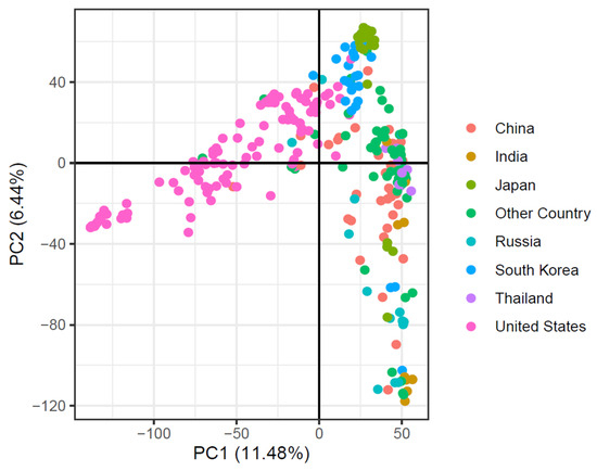 Using SNP marker data, principal component analysis (PCA) was applied to evaluate the soybean accessions’ population composition based on their country of origin. The first two main components explained 17.92% of the overall genetic variability (Figure 4). The major population structure was revealed by the PCA based on the cultivar’s origin.