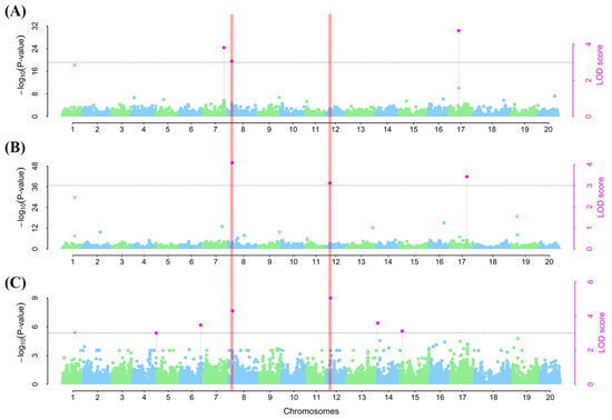 Manhattan plots for soybean red crown rot response via by emergence rate (A), survival rate (B), and disease severity (C) under a controlled environment in this study. The black dotted horizontal lines represent the threshold for significance at the logarithm of odd (LOD) = 3 and its corresponding −log (p-value). The blue and green dots fall below the threshold. The pink dots represent significantly linked SNPs to each of the studied indices. The vertical line in the (A–C) shows traits linked to a particular chromosome.