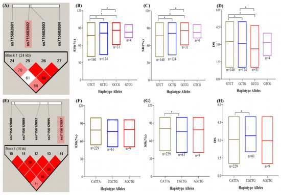 Haplo-phenotype analysis of stable single-nucleotide polymorphisms (SNPs) linked to at least two evaluated indices of soybean RCR response (shaded SNP). (A) Haplotype block around SNP ss715602602 on chromosome 8. (B) Phenotype (emergence rate, ER) grouping based on the four haplotype groups. (C) Phenotype (survival rate, SR) grouping based on the four haplotype groups. (D) Phenotype (disease severity, DS) grouping based on the four haplotype groups. (E) Haplotype block around SNP ss715612097 on chromosome 12. (F) Phenotype (emergence rate, ER) grouping based on the three haplotype groups. (G) Phenotype (survival rate, SR) grouping based on the three haplotype groups. (H) Phenotype (disease severity, DS) grouping based on the three haplotype groups. Means among haplotype groups were compared by a one-tailed t-test at 95% confidence level. * Significant at p < 0.05