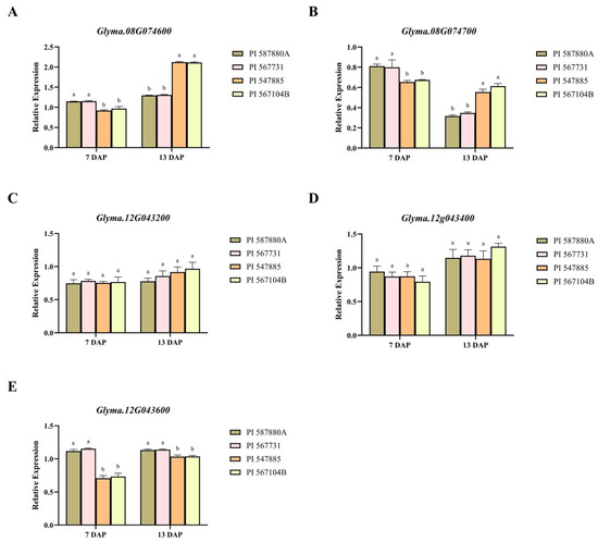 Expression patterns of five candidate genes (A) Glyma.08G074600, (B) Glyma.08G074700, (C) Glyma.12G043200, (D) Glyma.12G043400, and (E) Glyma.12G043600. Each putative gene’s mRNA concentrations in each candidate gene was analyzed in resistant soybean genotypes “PI 587880A and PI 567731” and susceptible genotypes “PI 547885 and PI 567104B”. A significant difference between means is marked by different letters (a and b) for each gene (p < 0.05). The different letters represent the significance differences.