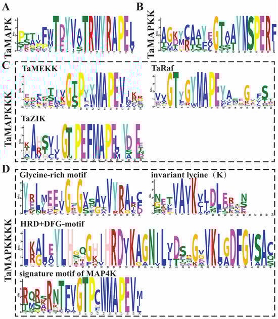 Conserved motifs of TaMAPK–TaMAP4K family genes in wheat. (A): the conserved motifs in MAPK proteins. (B): the conserved motif in MAP2K proteins. (C): the conserved motif in MAP3K (MEKK, Raf, and ZIK) proteins. (D): the conserved motif in MAP4K (Glycine-rich, invariant lysine (K), HRD, DFG, and signature motif of MAP4K) proteins. The height of symbols within the stack indicates the relative frequency(relative proportion and conserved property) of each amino at that position.