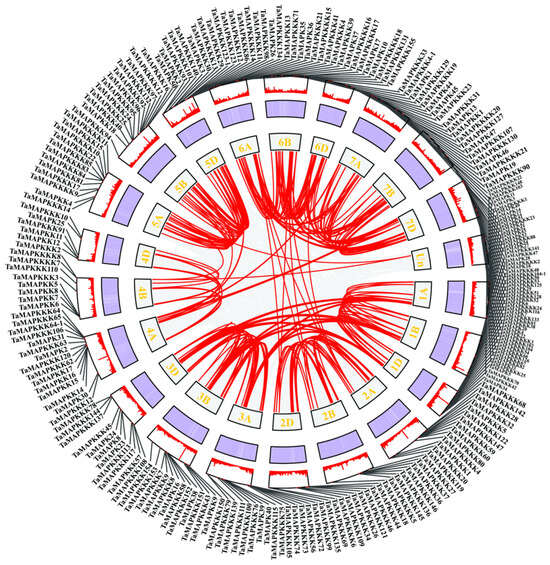 Schematic representations of TaMAPK–TaMAP4K cascade gene duplications. The gray line in the background indicates the homolinear pair in the whole wheat genome. Red lines indicate the collinear TaMAPK–TaMAP4K gene pairs. The chromosome number is displayed on each chromosome. The heatmap and line chart in the outer square represent gene density.