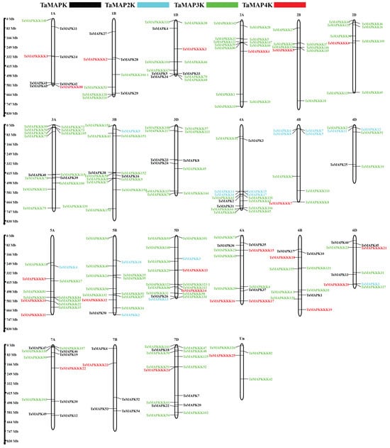 Chromosomal locations of TaMAPK–TaMAP4K cascade genes. The chromosome number is indicated at the top and the scale on the left represents the chromosome size. Black indicates TaMAPK, blue indicates TaMAP2K, green indicates TaMAP3K, and red indicates TaMAP4K.