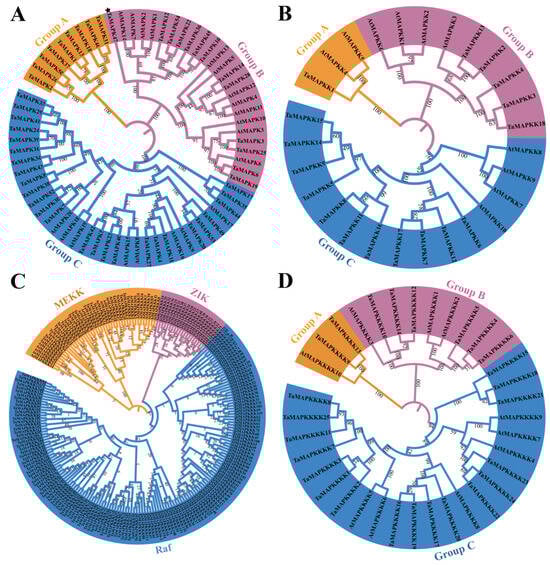 To better understand the evolutionary relationships between the TaMAPK–TaMAP4K cascade proteins, evolutionary analysis was conducted based on the amino acid and genomic sequences of wheat (Figure 4). The TaMAPK, TaMAP2K, and TaMAP4K family can be divided into three groups. Among them, Group C has the most genes (Figure 4). TaMAP3K family genes are grouped into three subtypes: RAF, MEKK, and ZIK. These are the same as in Arabidopsis and other species, with the RAF group having the most genes (Figure 4 and Table S1) []. Further, the conserved motifs of TaMAPK–TaMAP4K cascade genes are consistent with those previously reported in the green lineage []. The collinear relationship between wheat and Arabidopsis was similar to the phylogenetic results. Wheat and the five monocotyledonous plants have a significant level of collinearity, while collinearity with the dicotyledonous plant (Arabidopsis) was weakest, similar to the evolutionary relationship between monocotyledons and dicotyledons []. The new findings suggest that TaMAPK–TaMAP4K genes have been conserved throughout evolution.
