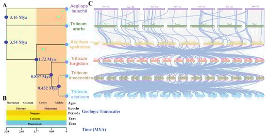 According to current research findings, it is suggested that T. urartu (AA), A. speltoides (BB), T. dicoccoides (AABB), A. tauschii (DD), and T. turgidum (AABB) collectively represent the closest ancestors of hexaploid wheat (AABBDD). In order to elucidate the phylogenetic relationships and homology within the MAPK–MAP4Ks family in wheat and its ancestral lineages, we conducted comprehensive phylogenetic and syntenic analyses using genomes of T. urartu, A. speltoides, T. dicoccoides, A. tauschii, T. turgidum, and T. aestivum (Figure 5). The phylogenetic tree presents estimated divergence times for individual nodes, denoted as 3.16 Mya, 3.54 Mya, 1.72 Mya, 0.897 Mya, and 0.432 Mya, respectively (Figure 5A). Furthermore, it incorporates geologic timescales encompassing Ages (Piacenzian, Gelasian, Lower, Middle), Epochs (Pliocene, Pleistocene), Periods (Neogene), Eras (Cenozoic), and Eons (Phanerozoic) (Figure 5B). The construction of the time tree enables us to understand the evolutionary history, phylogenetic relationships, and divergence times of the six species. It also allows for the inference of their common ancestors and respective evolutionary trajectories. Additionally, it reveals the sequential divergence and rates of differentiation among the six distinct species.