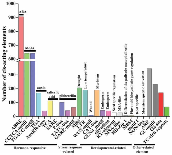 The number of cis-regulatory elements in the promoter regions of TaMAPK–TaMAP4K cascade genes. The names of the cis-regulatory elements are listed at the bottom of the image, and the corresponding functional annotations are listed above the image.