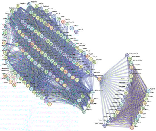 Interaction networks of TaMAPK–TaMAP4K were analyzed using STRING (https://string-db.org/cgi/input.pl, 11 September 2023). The wheat database was used as a reference (https://plants.ensembl.org/index.html, 22 September 2023). The predictions were stored in TSV format and then loaded into the Cytoscape V3.10.1 program [] for display.