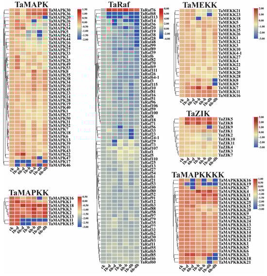 Clustering of the expression patterns of the 234 TaMAPK–TaMAP4K cascade genes in wheat under drought, heat, and combined drought and heat stresses (1 h drought–(1 h–d), 6 h drought–(6 h–d), 1h heat–(1 h–h), 6 h heat–(6 h–h), 1h drought and heat–(1 h–dh), 6 h drought and heat–(6 h–dh)). Log10 logarithmic transformation treatment was applied to gene expression analysis. High levels of gene expression are in red and low levels of gene expression are shown in blue.