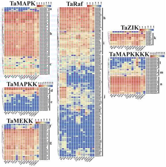 Clustering of the expression patterns of the 234 TaMAPK–TaMAP4K cascade genes in wheat at 15 different developmental stages (seedling roots: root_10 days (SR), roots at three-leaf stage: root_13 days (RTLS), roots at meiosis stage: root_39 days (RMS), stems at the 1 cm spike stage: stem_30 days (S1S), stems at the two nodes stems stage: stem_32 days (STNS), stems at anthesis stage: stem_65 days (SATS), seedling leaves: leaf_10 days (SL), leaves at three tillers stage: leaf_23 days (LTTS), leaves at 2 days after anthesis stage: leaf_71 days (L2DAAs), spikes at two nodes stems stage: spike_32 days (SPTNS), spikes at the meiosis stages: spike_39 days (SPMS), spikes at anthesis stage: spike_65 days (SPAS), grains at 2 days after anthesis stage: grain_71 days (G2DAAs), grains at 14 days after anthesis stage: grain_75 days (G14DAAs), grains at 30 days after anthesis stage: grain_85 days (G30DAAs)). Log10 logarithmic transformation treatment was applied when analyzing gene expression. Red indicates high gene expression and blue indicates low expression. The letters a–n indicate the groups of genes with different expression levels.