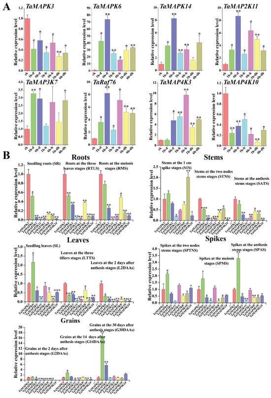 Quantitative RT-PCR analysis of 16 TaMAPK–TaMAP4K genes. (A): Relative expression levels of 8 TaMAPK–TaMAP4K genes under 3 different stress treatments ((Check-CK), 1 h drought-(1 h-d), 6 h drought-(6 h-d), 1h heat-(1 h-h), 6 h heat-(6 h-h), 1h drought and heat-(1 h-dh), 6 h drought and heat-(6 h-dh)). (B): Relative expression levels of 8 TaMAPK–TaMAP4K genes at 15 developmental stages (seedling roots: root_10 days (SR), roots at three-leaf stage: root_13 days (RTLS), roots at meiosis stage: root_39 days (RMS), stems at the 1 cm spike stage: stem_30 days (S1S), stems at the two nodes stem stage: stem_32 days (STNS), stems at anthesis stage: stem_65 days (SATS), seedling leaves: leaf_10 days (SL), leaves at three tillers stage: leaf_23 days (LTTS), leaves at 2 days after anthesis stage: leaf_71 days (L2DAAs), spikes at two nodes stems stage: spike_32 days (SPTNS), spikes at the meiosis stage: spike_39 days (SPMS), spikes at anthesis stage: spike_65 days (SPAS), grains at 2 days after anthesis stage: grain_71 days (G2DAAs), grains at 14 days after anthesis stage: grain_75 days (G14DAAs), grains at 30 days after anthesis stage: grain_85 days (G30DAAs)). TaMAPK3 gene expression data from different stages and tissues were used as the control. Vertical bars indicate standard deviations (* p < 0.05, ** p < 0.01, *** p < 0.001, Student’s t-text).