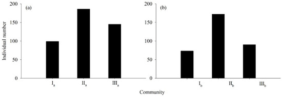 The results of this survey found that a total of 765 Rhododendron plants were examined for the two orders of succession. To be specific, there were 430 R. annae plants (99, 186, and 145 in communities Ia, IIa, and IIIa, respectively) and 335 R. irroratum plants (73, 172, and 90 in communities Ib, IIb, and IIIb, respectively). The quantity of R. annae was 128.36% of that of R. irroratum (Figure 1).