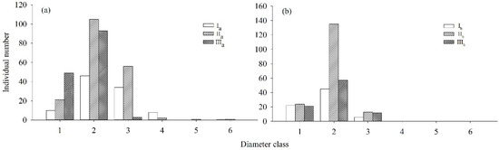 The analysis method of replacing age structure with diameter class structure [34] was adopted to divide R. annae and R. irroratum in the above quadrats into six age classes and six height classes according to their stem base diameter and height, respectively. To be specific, the age classes included age class i of <2 cm (ii, 2–4 cm; iii, 4–6 cm; iv, 6–8 cm; v, 8–10 cm; vi, >10 cm). The height classes included height class i of <1 m (ii, 1–2 m; iii, 2–3 m; iv, 3–4 m; v, 4–5 m; vi, >6 m).