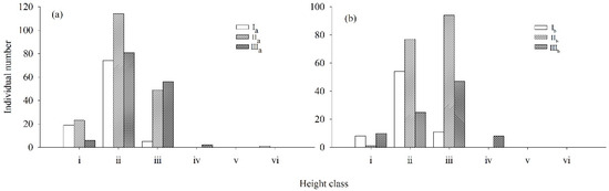 R. annae (communities Ia, IIa, and IIIa) and R. irroratum (communities Ib, IIb, and IIIb) were both dominated by height classes i, ii, and iii. The total quantities of R. annae and R. irroratum at these three height classes accounted for 99.53% and 97.61% of the total quantity of Rhododendron plants, respectively. There were few Rhododendron plants at height class iv, v, or vi, except for twelve R. annae plants and eight R. irroratum plants. The individual numbers of R. annae (communities Ia, IIa, and IIIa) and R. irroratum (communities Ib, IIb, and IIIb) both presented a trend of increasing first and then decreasing with increasing height. The plant numbers of R. annae at height classes i and ii presented a trend of increasing first and then decreasing with orders of succession. There were 19, 23, and 6 R. annae plants at height class i, as well as 74, 114, and 81 R. annae plants at height class ii, respectively. The plant number of R. annae at height class iii exhibited a gradually increasing trend with orders of succession. There were 5, 114, and 81 R. annae plants at height class iii, respectively. At height classes iv and vi, communities IIIa and Ia each contained one R. annae plant. The height structures of R. annae in the three communities with different orders of succession both represented the expanding type (Figure 3).
