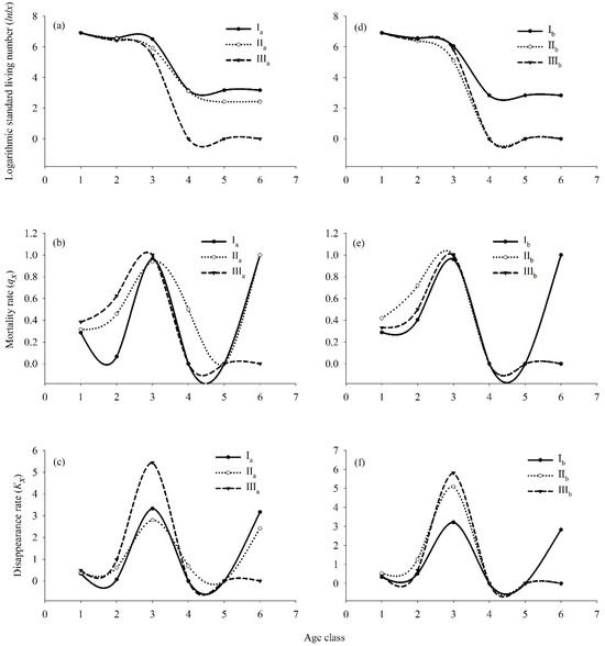 The logarithmic standardized survival numbers (lnlx) of R. irroratum in communities Ib, IIb, and IIIb also gradually decreased with increasing age class, and all survival curves fell between Deevey-II and Deevey-III. As shown by the model tests in Table 3, the R2 of the exponential function model for R. irroratum in communities Ib, IIb, and IIIb was uniformly greater than that of the power function model; therefore, the survival curves of R. irroratum in communities Ib, IIb, and IIIb tended to be closer to Deevey-II. The mortality rate and disappearance rate curves of R. irroratum in communities Ib, IIb, and IIIb both showed a trend of increasing first, then decreasing, and finally increasing again with increasing age class, and peaked at age classes three or four.
