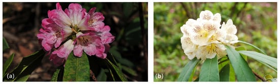 - Chamberlain, D.; Hyam, R.; Argent, G.; Fairweather, G.; Walter, K. The Genus Rhododendron: Its Classification and Synonymy; Royal Botanic Garden Edinburgh: Edinburgh, UK, 1996. [Google Scholar]